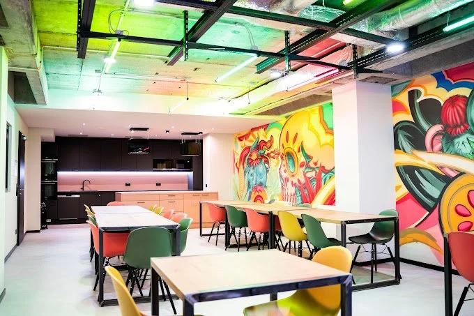 An array of community spaces give the Base its character, each an embodiment of distinct flair and purpose. The cinema, a , boasts plush seating and obscure lights, inviting residents to lose themselves in the magic of film. The library, a cozy space with reading nooks and warm wooded shelves doesn’t take itself too seriously. In the playroom, vibrant hues and whimsical murals create a welcoming atmosphere .
